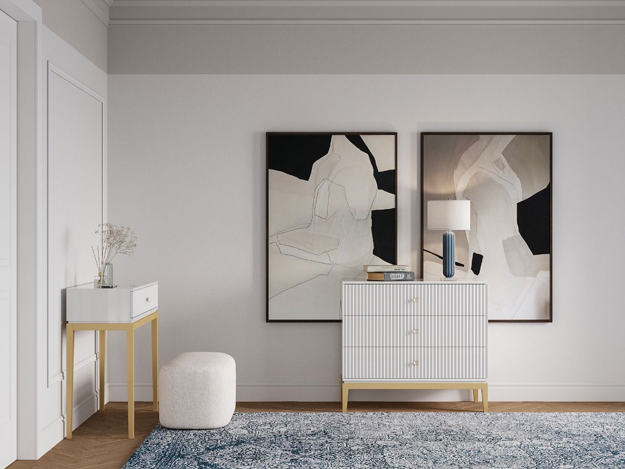В уже оформленную мастер спальню заказчики приобрели у нас корпусную мебель из серии ГРАСС: прикроватные тумбы, консоль, комод, пуф на латунном основании. Выкрас эмали RAL 1013, с отделкой золотом. Для пуфа мы предложили ту же ткань, что и на стеновых панелях. Наша мебель дополнила интерьер спальни, заказчики довольны. Благодарим за доверие и заказ!