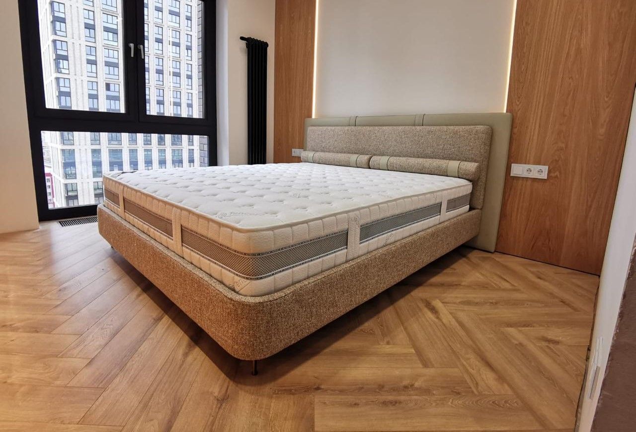 Изначально для проекта была выбрана другая модель, но в процессе ремонта были внесены коррективы и кровать "Джованни" украсила интерьер современной спальни в теплых тонах. Для обивки кровати была выбрана натуральная кожа немецкого производства, и мягчайшая бельгийская рогожка с зернистой текстурой. Кровать изготовлена с бельевым коробом, на высоких ножках. Матрас беспружинный Dela latticci. Изголовье чуть сократили по ширине, чтобы не перекрывало розетки. Благодарим заказчиков за доверие и возможность принять участие в реализации!